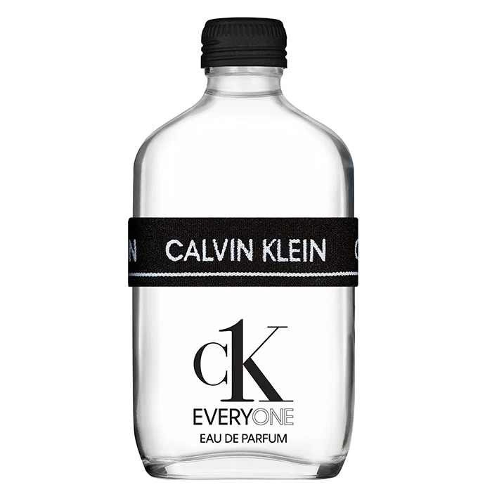 El frasco de Calvin Klein CK Everyone Eau de Parfum en forma de petaca y un vidrio transparente, se adorna con una banda elástica negra multiusos con el logo de la marca, que recuerda a la ropa interior de la firma. Su tapón negro mate es reciclable.