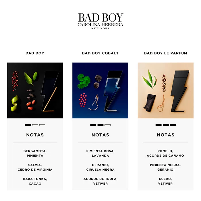 Su fragancia aromática es una expresión de dualidad, reflejo de la naturaleza atrevida del hombre actual. Bad Boy es un perfume para un hombre sofisticado y llamativo que combina notas de pimienta blanca y negra con la vitalidad cítrica de la bergamota verde de Italia.