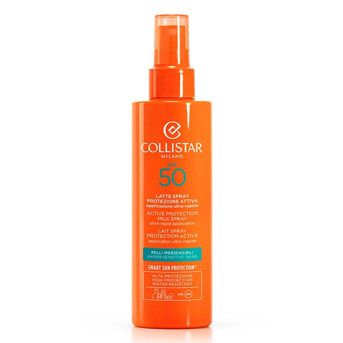 Leche Spray Protección Activa SPF50 de Collistar es una protección solar del rostro y cuerpo para pieles sensibles o reactivas.