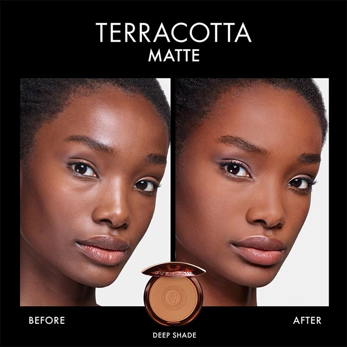 Los polvos Terracotta Matte de Guerlain tienen un tono dorado para aportar calidez a la piel y esculpir los rasgos de la tez. Su textura suave, confortable y ultrafina se difumina perfectamente para modular con precisión la intensidad de color.