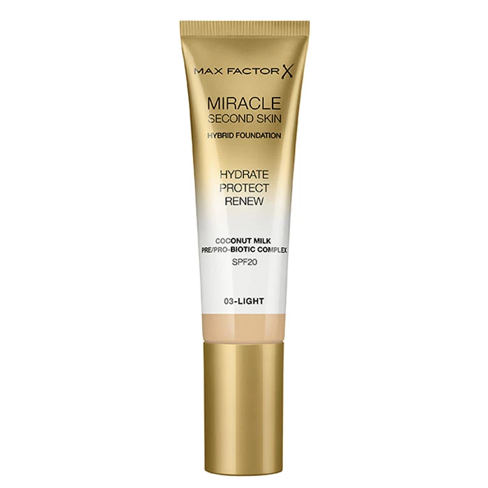 Esta base de maquillaje de Max Factor de cobertura ligera está enriquecida con ingredientes naturales como la leche de coco, el aceite de coco y el aloe vera que ayudan a hidratar la piel durante todo el día. Su fórmula con factor SPF20 refuerza y favorece la protección de la piel, además los prebióticos y probióticos ayudan al sistema inmunológico natural y ayudan a la regeneración de la piel.