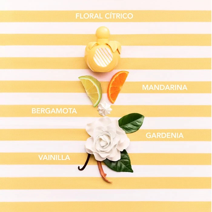 Nina Soleil Eau de Toilette pertenece a la familia olfativa Floral Cítrica y comienza por unas notas de salida de mandarina y bergamota que acentúan su ligero frescor. En su corazón la luminosa y empolvada gardenia subraya su dulzura junto con el acorde de chantilly. Su encanto es irresistible, y aún más cuando el suave cedro y la vainilla particularmente apetitosa completan esta deliciosa fragancia.