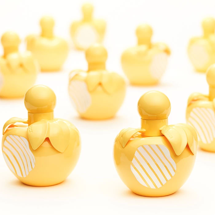 El frasco icónico de Nina Ricci en forma de manzana se viste esta vez de un tono amarillo soleado y optimista para Nina Soleil, como si hubiese absorbido los rayos de sol del verano.