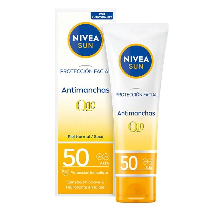 Protección Facial Antimanchas Q10 SPF50 de Nivea es un protector para el rostro que previene y combate arrugas y manchas.